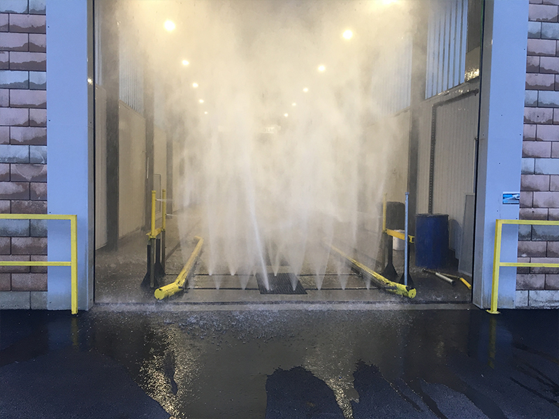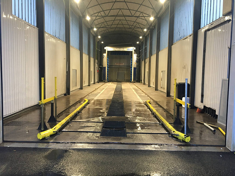 Station équipée d’un tunnel de lavage haute pression, d’une fonction lavage châssis et lavage rouleaux.